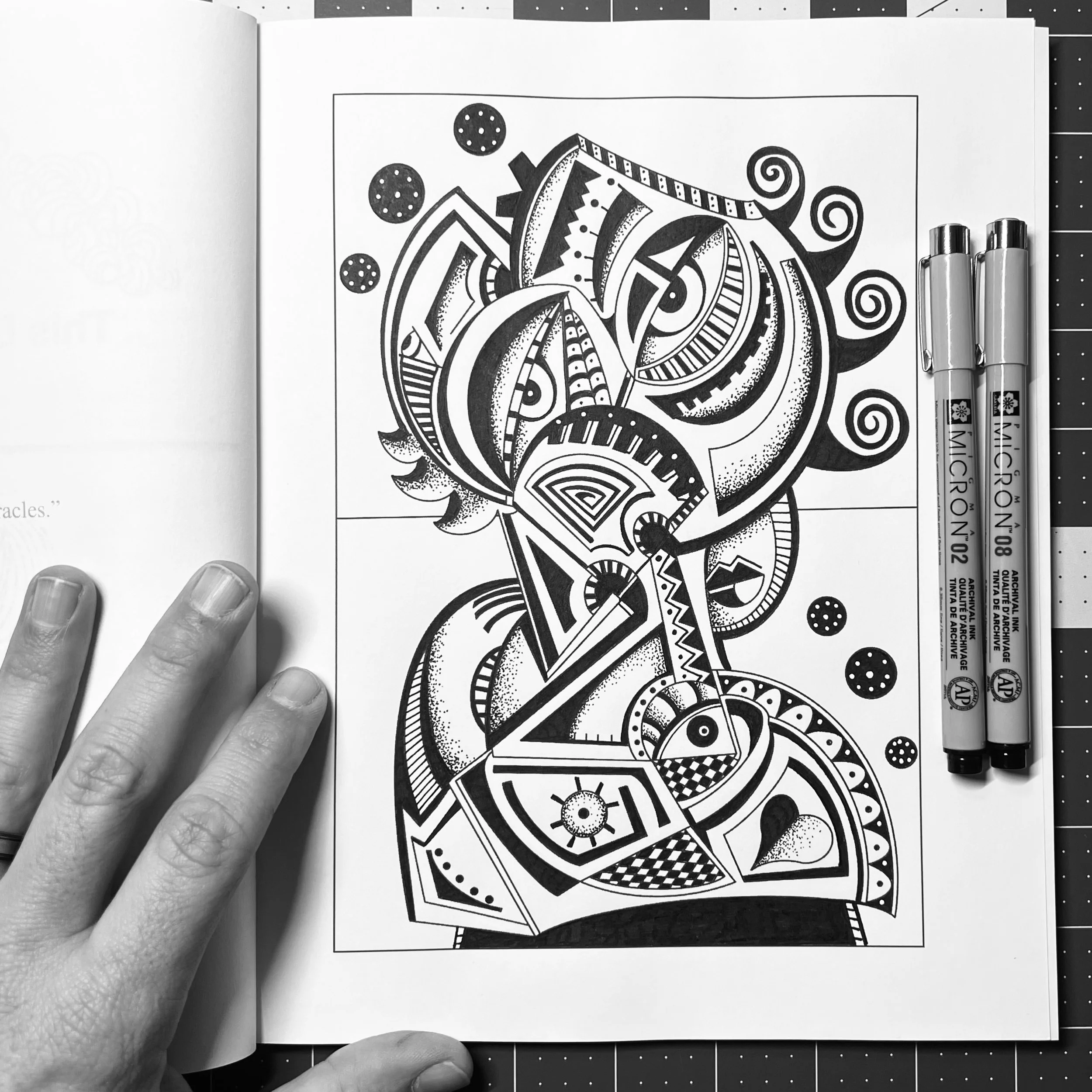 Armed with my trusty black-and-white Micron pens, I began inking over the Cubist illustration, curious about how it would look when reimagined in my signature monochromatic style. The process was immersive, almost meditative, as I revisited the mindset in which I had originally created the piece. To my delight, the finished artwork exceeded my expectations. The bold contrasts and intricate details gave the illustration new life and added dimension.